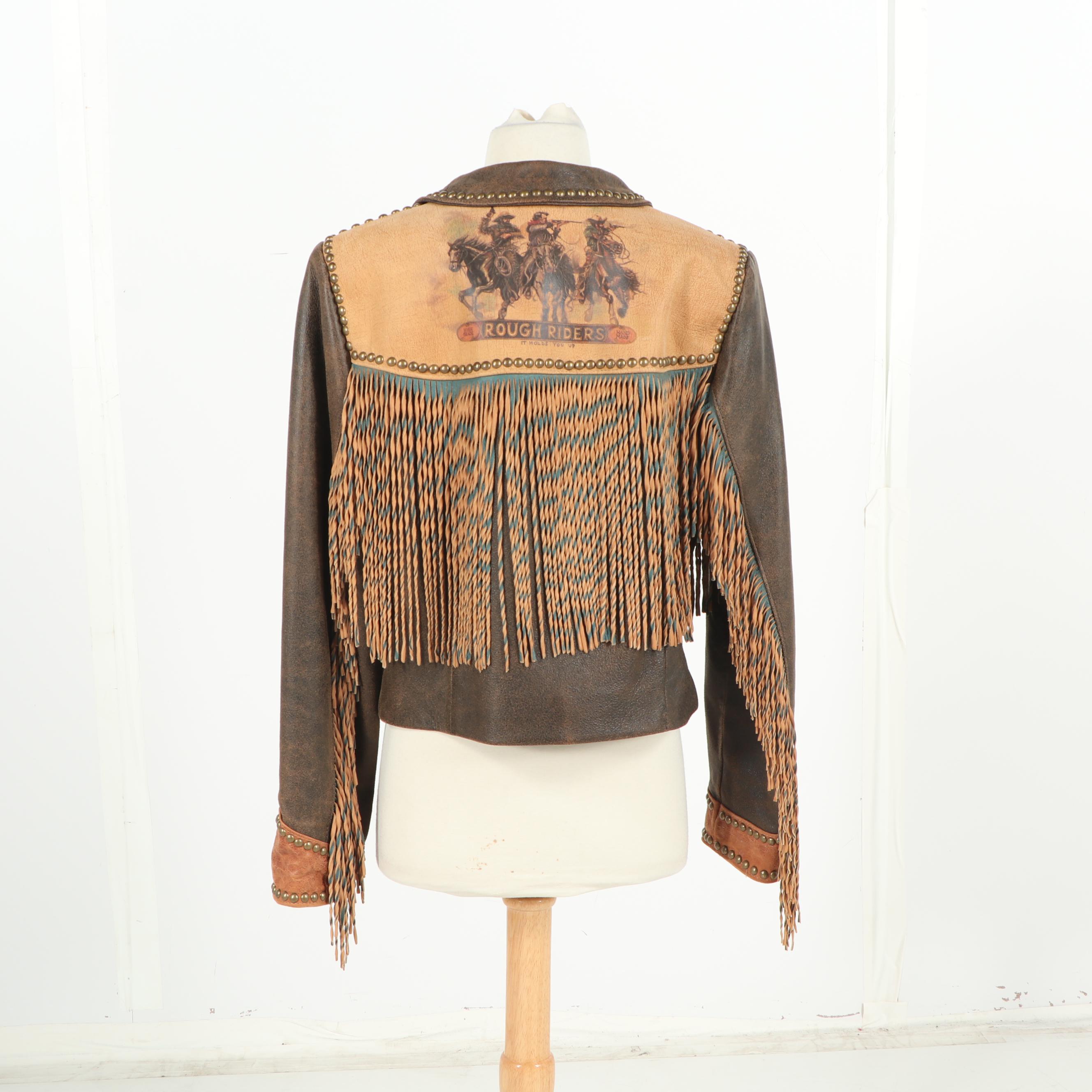 Fringe Leather Jacket With Painted Cactus / A lightly studded motorcycle jacket for women made of heavy yet soft cowhide leather.